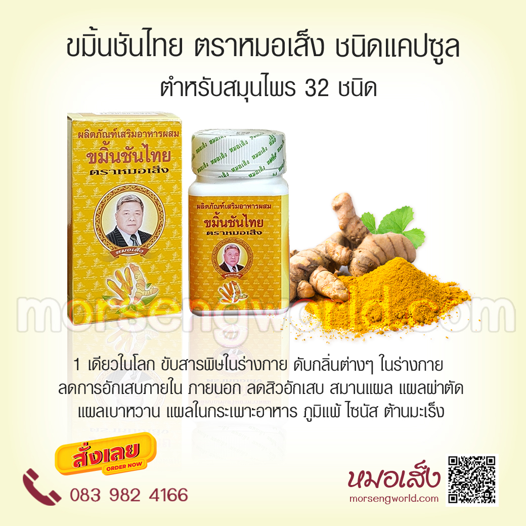 ผลิตภัณฑ์เสริมอาหารหมอเส็ง ผสมขมิ้ันชันไทย (แคปซูล) + กำจัดกลิ่นอันไม่พึงประสงค์ + ขับสารพิษในร่างกาย + แก้กรดไหลย้อน + สมานแผลในกระเพาะ + ลดอาการภูมิแพ้ + ช่วยสมานแผลเบาหวาน